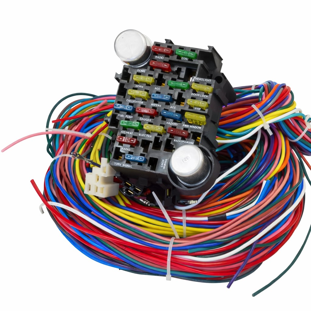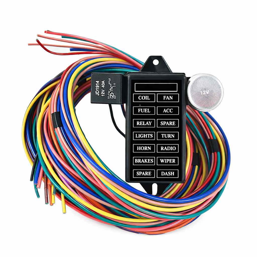 Faisceau Électrique Universel Semi-Fini – Boîte à Fusibles 14 Circuits Pré-Câblée + 2 Relais – Fils Gravés – Châssis Complet