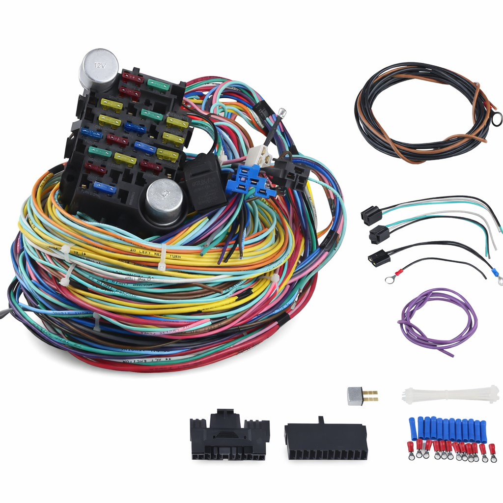Faisceau Électrique Universel semi fini 21 Circuits – Boîte à Fusibles Pré-Câblée + 3 Relais – Fils Gravés – Châssis Complet