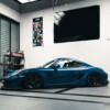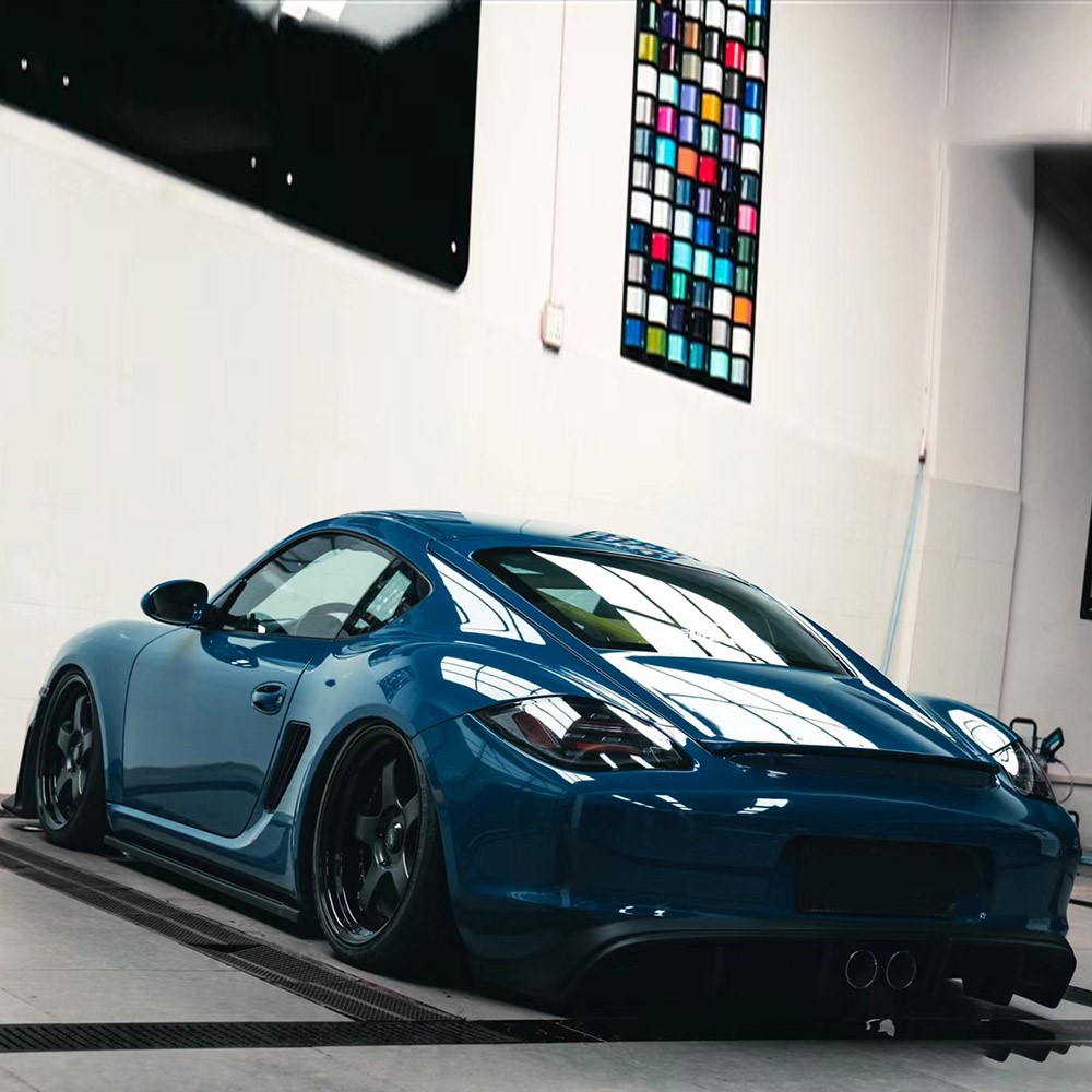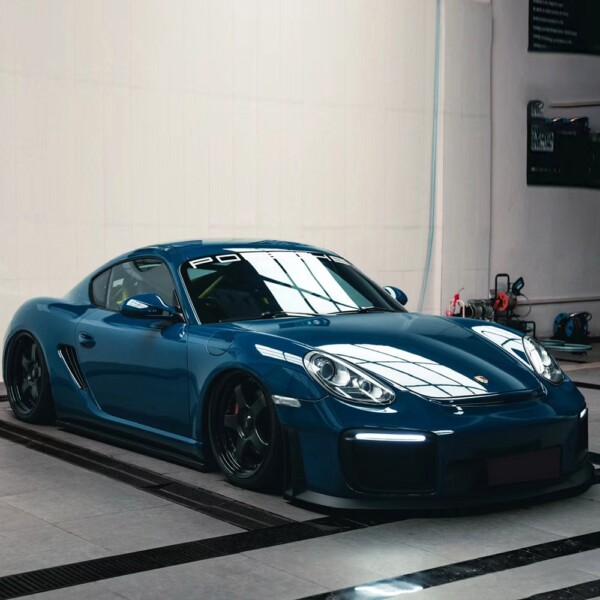 Hochglänzende blaue Folie, auch bekannt als „Porsche Deep Blue„, mit schönen Reflexen, um Teile zu imitieren, die in der Karosserie mit den glänzendsten Lacken, den sogenannten „Thixotropen“, bemalt und anschließend lackiert wurden.