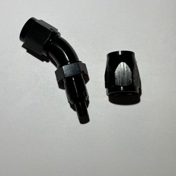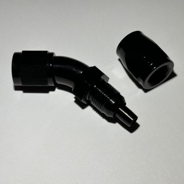 CNC-machined dash 4 fitting in black anodised aluminium.
