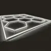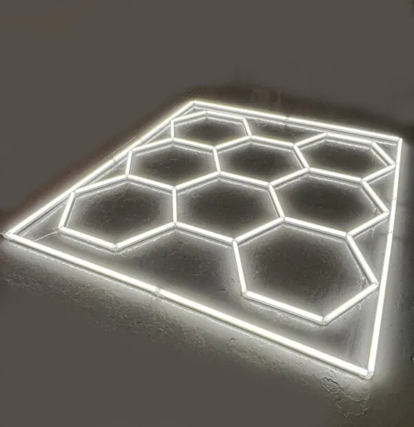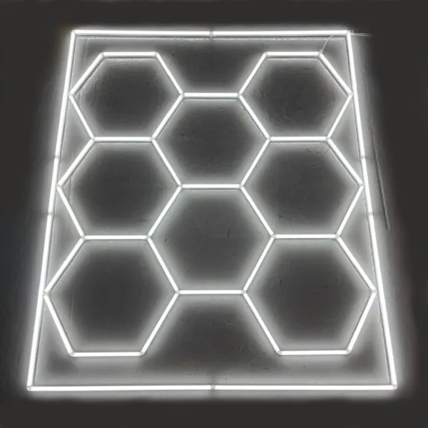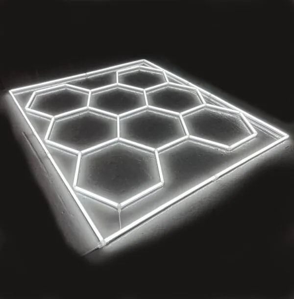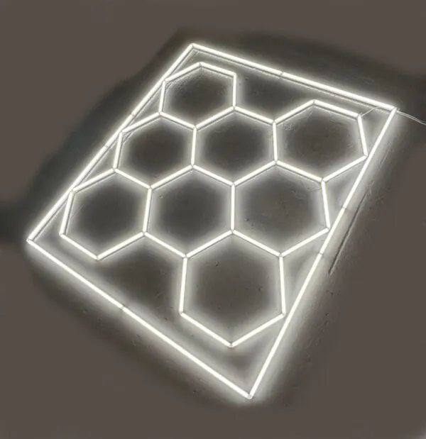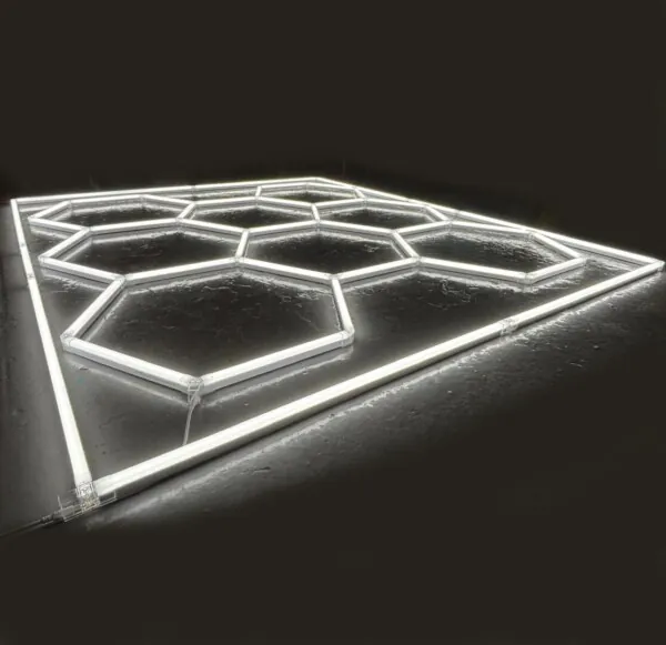 This hexagonal honeycomb-style luminaire provides powerful lighting for your workshop, hairdressing salon or sports hall.