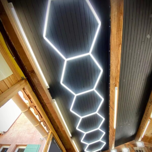This hexagonal honeycomb-style luminaire provides powerful lighting for your workshop.