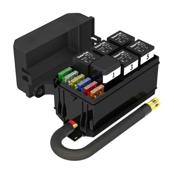 Con esta caja de relés y fusibles, acabe con los circuitos eléctricos confusos y desordenados.Centralice todos sus relés fusibles en una sola caja.Los cables pasan por la parte inferior, tapa con clip en la parte superior .