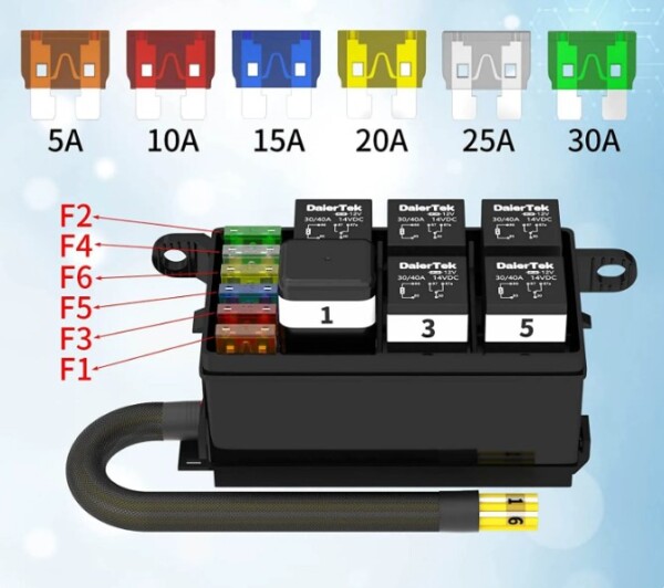 Caja con 6 relés de 40 amperios + 6 fusibles normales, precableada y mazo de cables etiquetado.