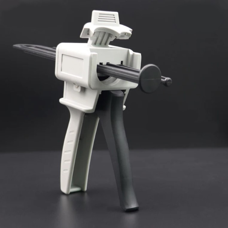 Cada vez que se aprieta el gatillo, el émbolo permanece presionado en el tubo, permitiendo que el pegamento salga y se mezcle en la boquilla.