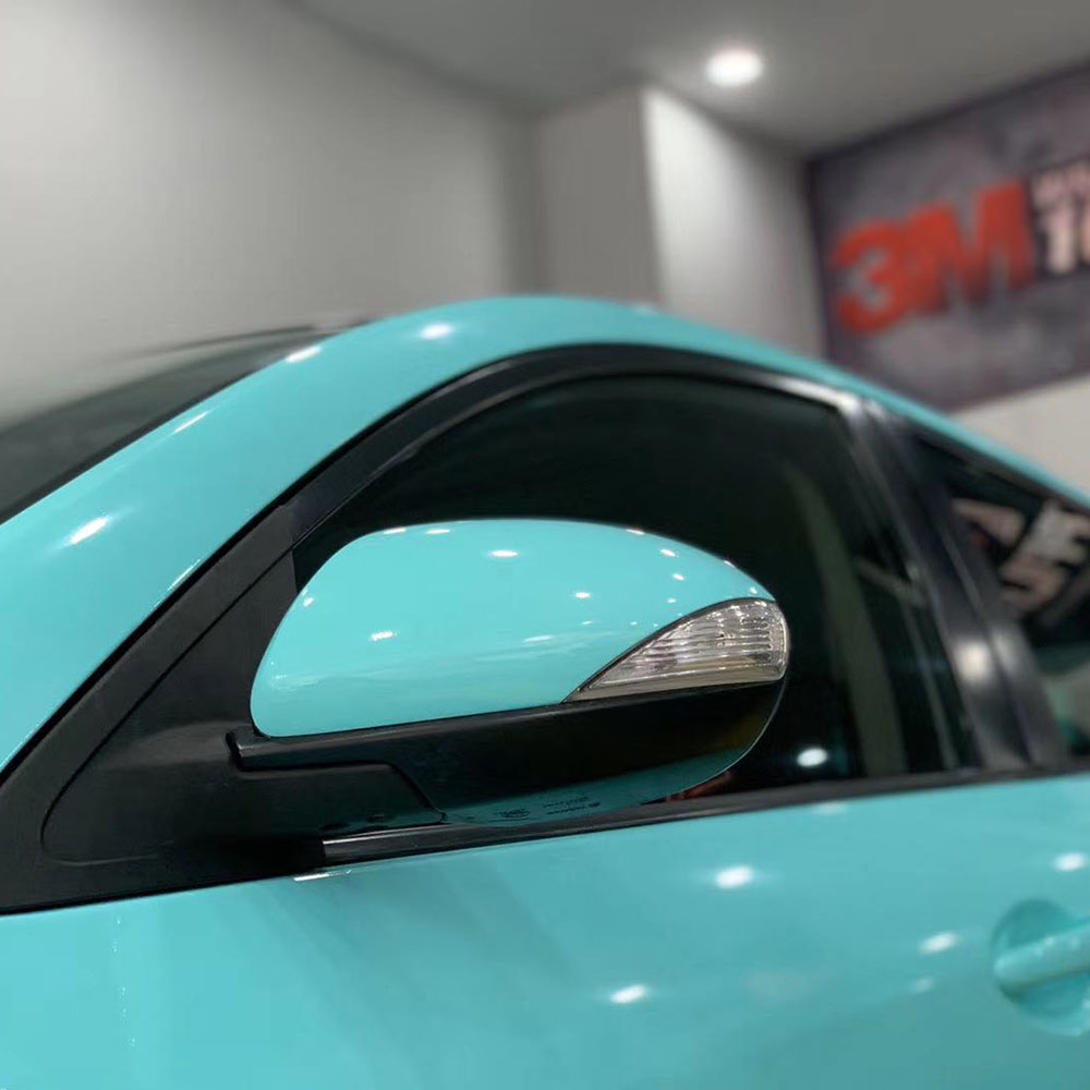 Vinilo azul turquesa de alto brillo también conocido como «tangara» con bellos reflejos para imitar piezas pintadas y barnizadas en carrocería con los barnices más brillantes conocidos como «tixotrópicos».