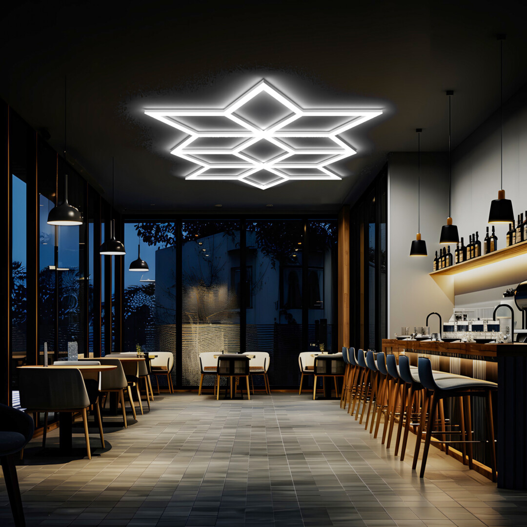Ce luminaire en forme hexagonale style nid d’abeilles + triangles, dispose un éclairage puissant pour votre atelier, salon de coiffure et salle de sport.