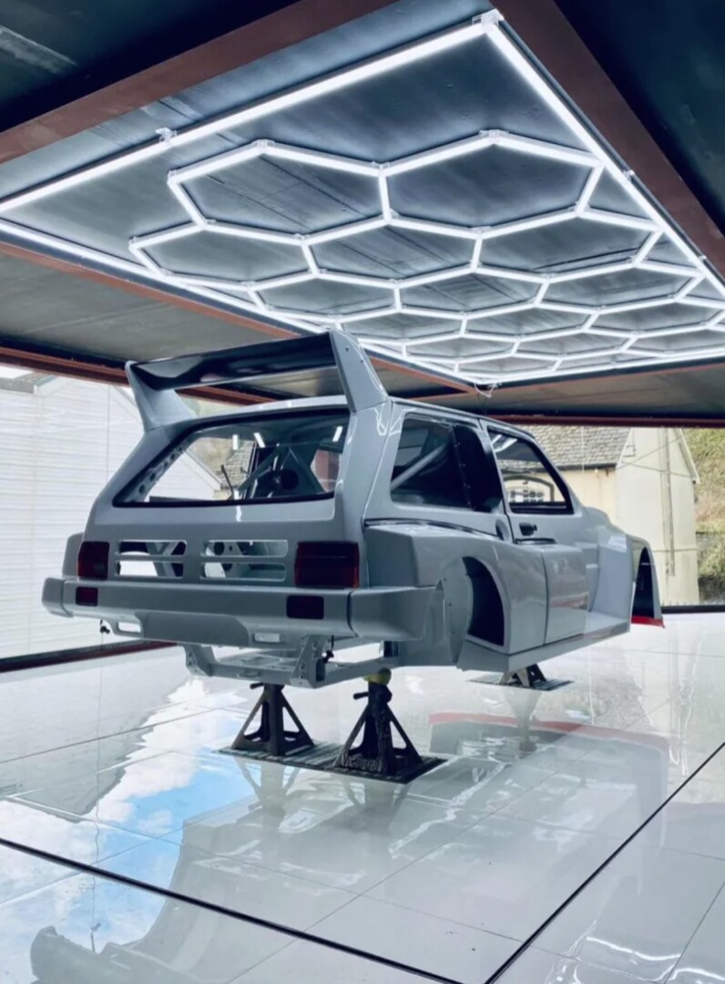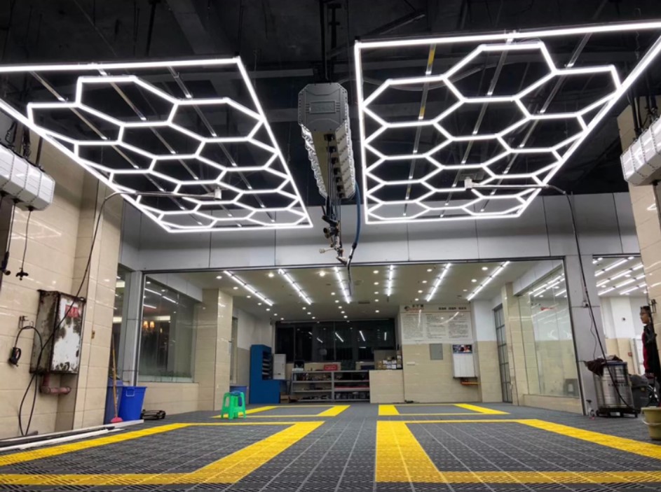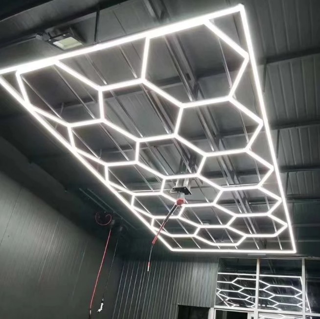 Lampe LED hexagonale nid d’abeille – 2,4 m x 4,8 m – 550W – 230V – 6500K est un éclairage architectural de haute performance, spécialement conçu pour les espaces professionnels exigeants : garages, studios detailing, barbershops, salles de sport et showrooms automobiles.
