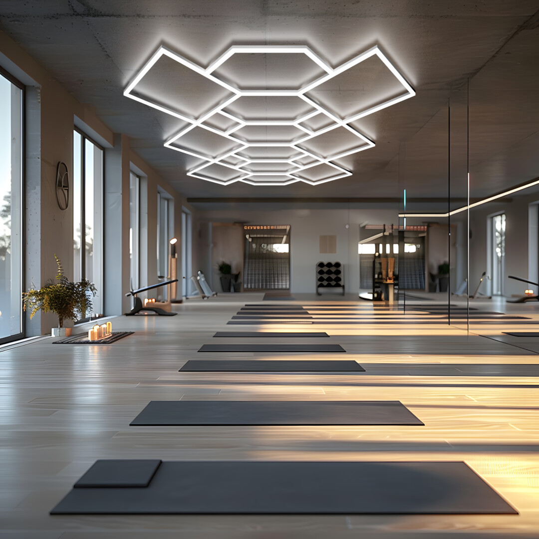 Ce luminaire en forme hexagonale style nid d’abeilles + triangles, dispose un éclairage puissant pour votre atelier, salon de coiffure et salle de sport.