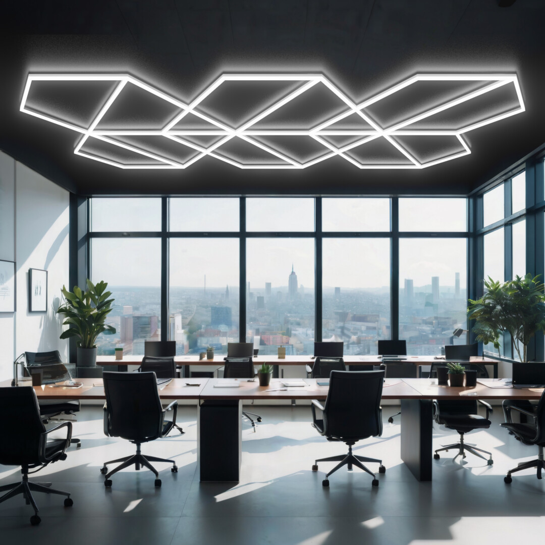 Ce luminaire en forme hexagonale style nid d’abeilles + triangles, dispose un éclairage puissant pour votre atelier, salon de coiffure et salle de sport.