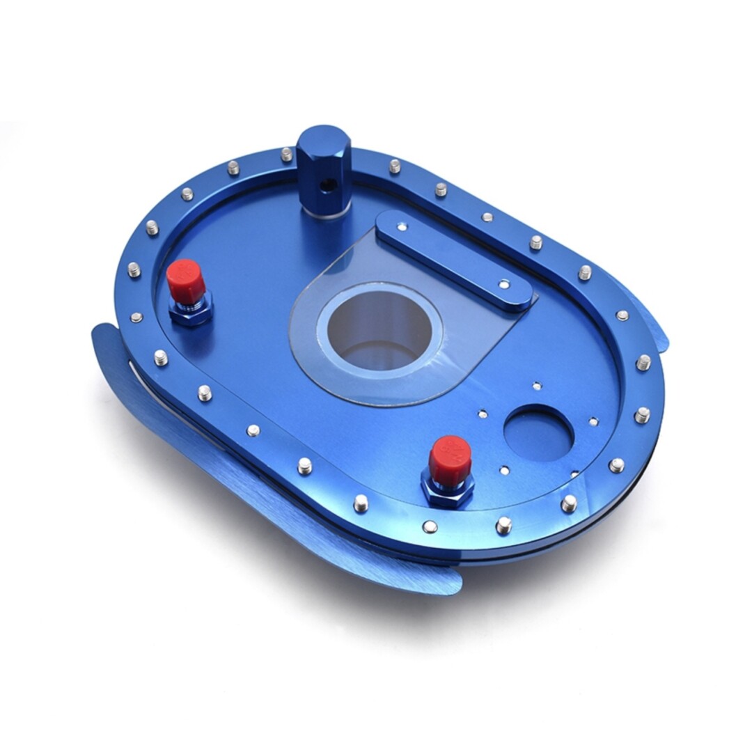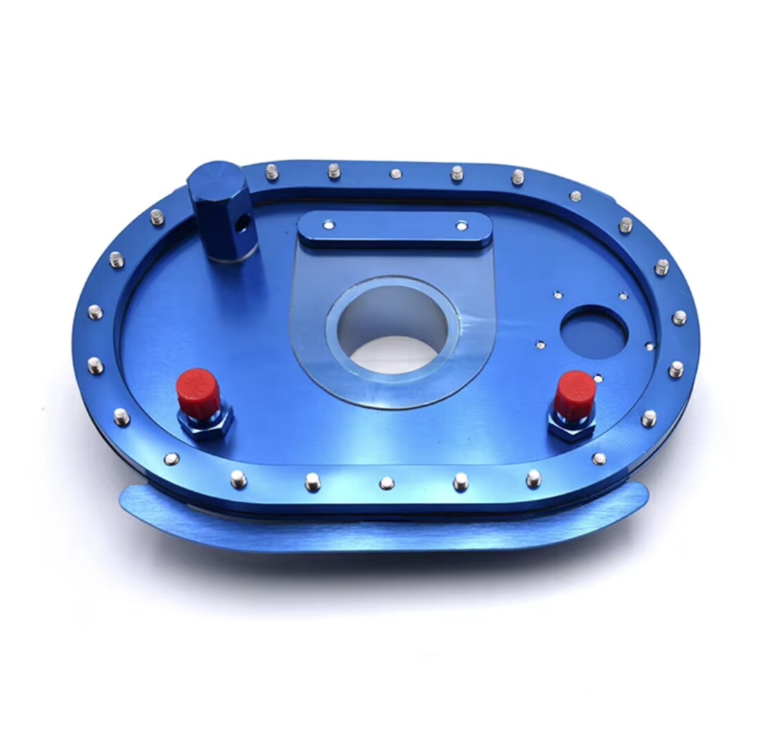 Platine en aluminium usiné CNC 5 axes, entièrement compatible avec les réservoirs ATL FIA et équipée d’un joint intégré en sandwich pour une étanchéité optimale.