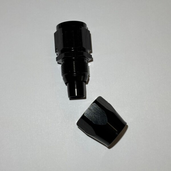 Raccord usiné CNC AN10 en aluminium anodisé noir.